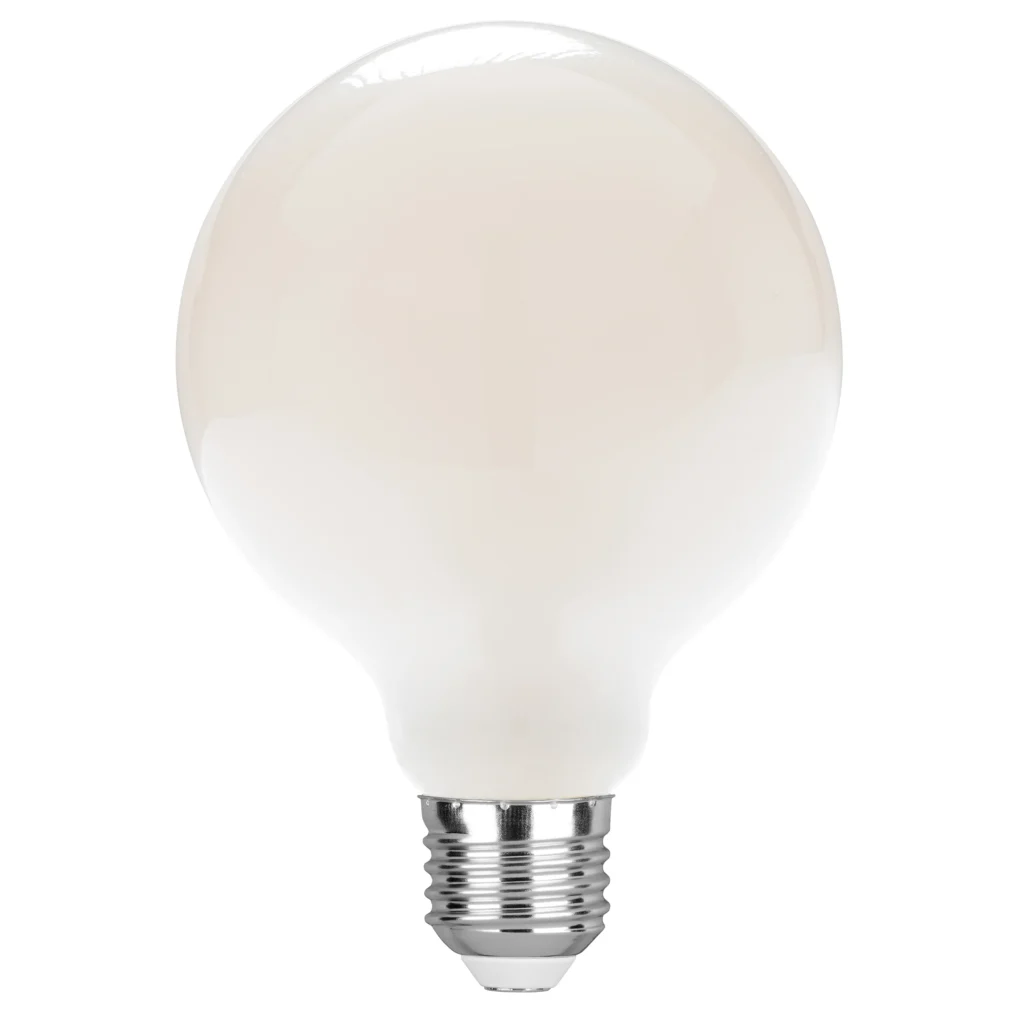 L’ampoule LED globe E27 95mm se distingue par son verre blanc dépoli qui apporte une touche de sophistication intemporelle à votre intérieur. Sa forme généreuse de 95mm de diamètre et son filament COB visible créent un équilibre parfait entre design contemporain et esthétique rétro.