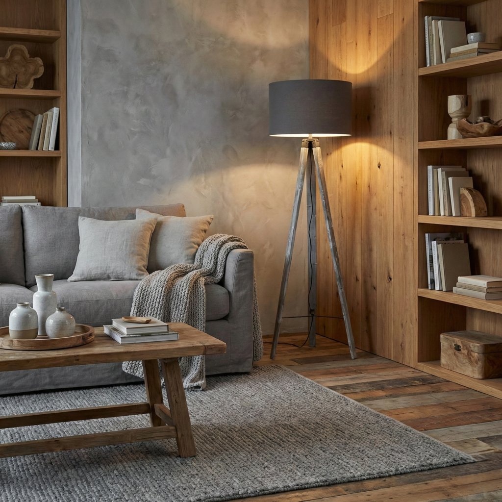 L’abat-jour conique en tissu aux délicates nuances gris tourterelle diffuse une lumière douce et enveloppante, idéale pour créer une ambiance cocooning. Le contraste subtil entre la structure organique du bois et la douceur du textile compose un équilibre visuel parfait, oscillant entre esprit nature et élégance contemporaine. Avec sa hauteur généreuse de 156 cm, ce lampadaire s’impose comme une pièce maîtresse sans jamais écraser l’espace.