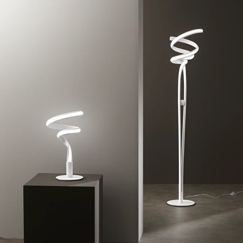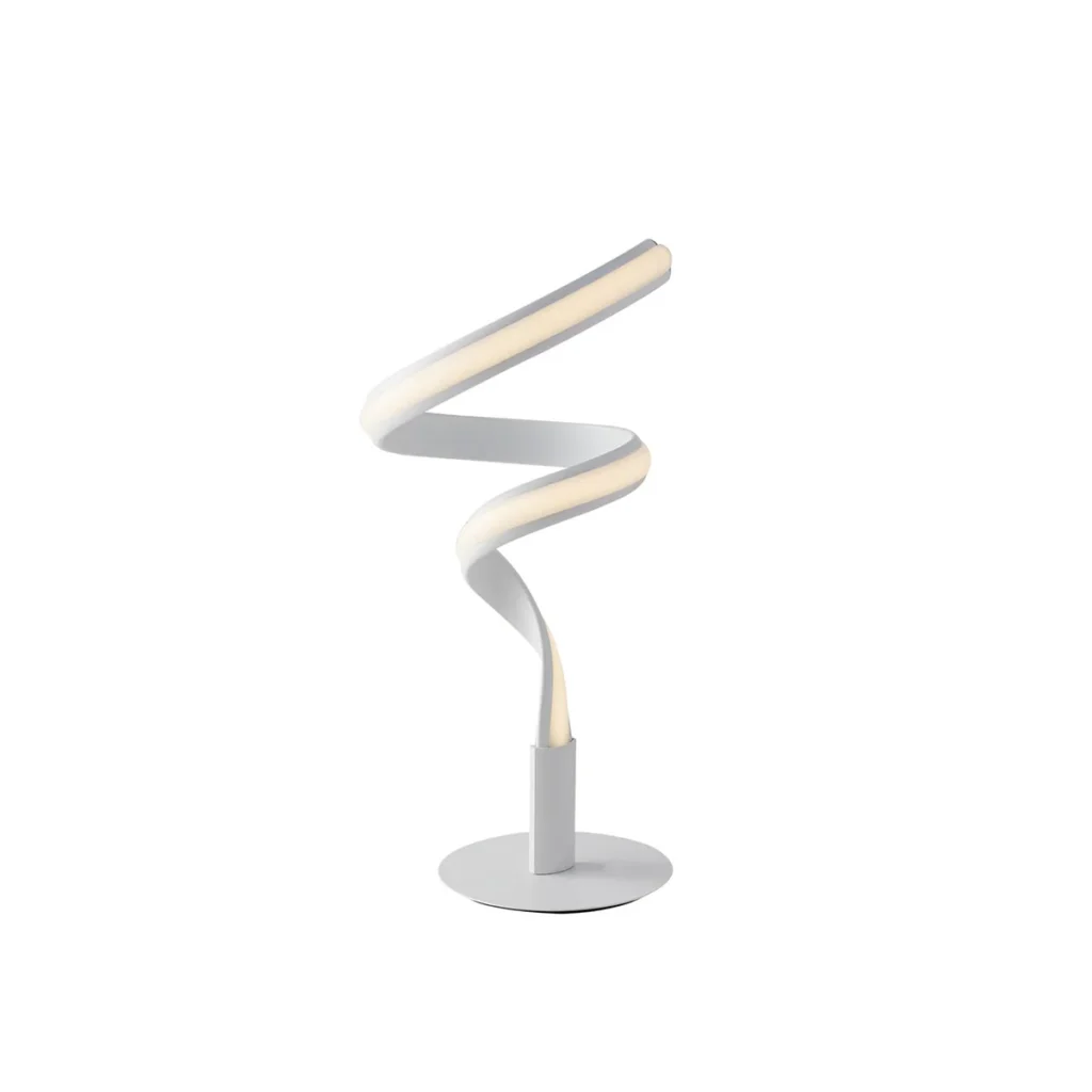 Lampe à poser design MYSTRAL aux formes sinueuses. 15W, 1800lm, CCT 3000K-6500K. Aluminium blanc gaufré & silicone. Commandez en ligne !