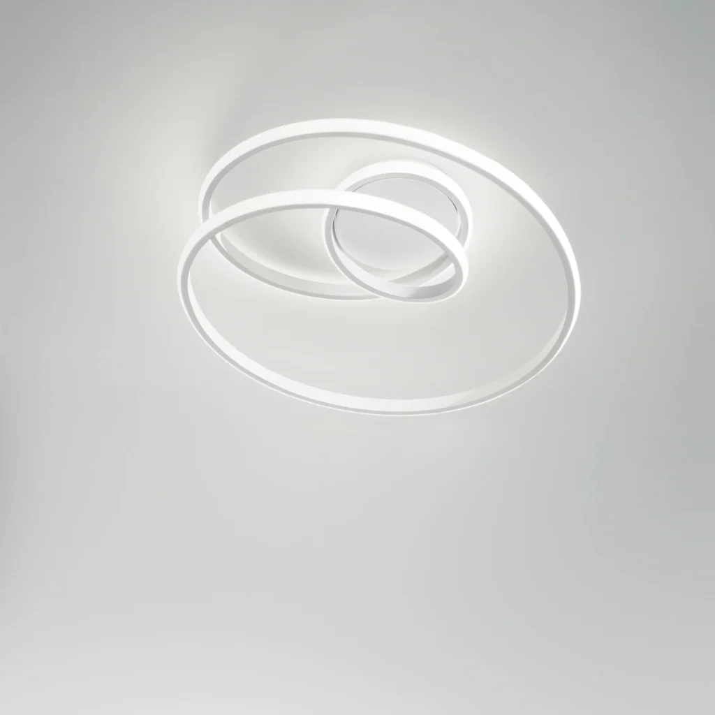 Le plafonnier COASTER réinvente l’éclairage de plafond en véritable élément décoratif. Sa structure en aluminium compose des cercles superposés à plusieurs niveaux, créant un jeu de volumes et de reliefs captivant. Le diffuseur en silicone blanc enveloppe chaque anneau d’une lumière douce et uniforme, sans aucune zone d’ombre ni éblouissement.