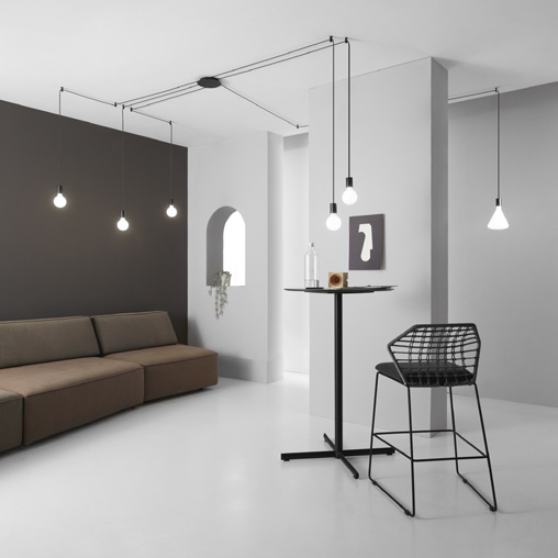 La gamme propose trois configurations pour répondre à tous les besoins : la version mono-lumière (rosace Ø12 cm) parfaite pour les espaces intimistes, la version triple (rosace Ø19 cm) idéale pour les tables à manger ou îlots de cuisine, et la version sextuple (rosace Ø19 cm) conçue pour illuminer avec caractère les grands volumes comme les séjours ouverts ou les espaces professionnels.