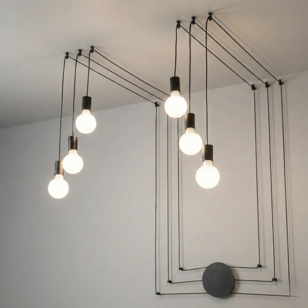 Le plafonnier HABITAT incarne une vision contemporaine de l’éclairage suspendu où chaque installation devient une création unique. Sa conception modulaire en métal avec finition mate soignée se décline en deux teintes essentielles : le noir intense pour les intérieurs affirmés et graphiques, et le blanc immaculé qui apporte légèreté et luminosité. Les lignes épurées des douilles apparentes et des câbles textiles créent une esthétique industrielle raffinée qui séduit les amateurs de design minimaliste.