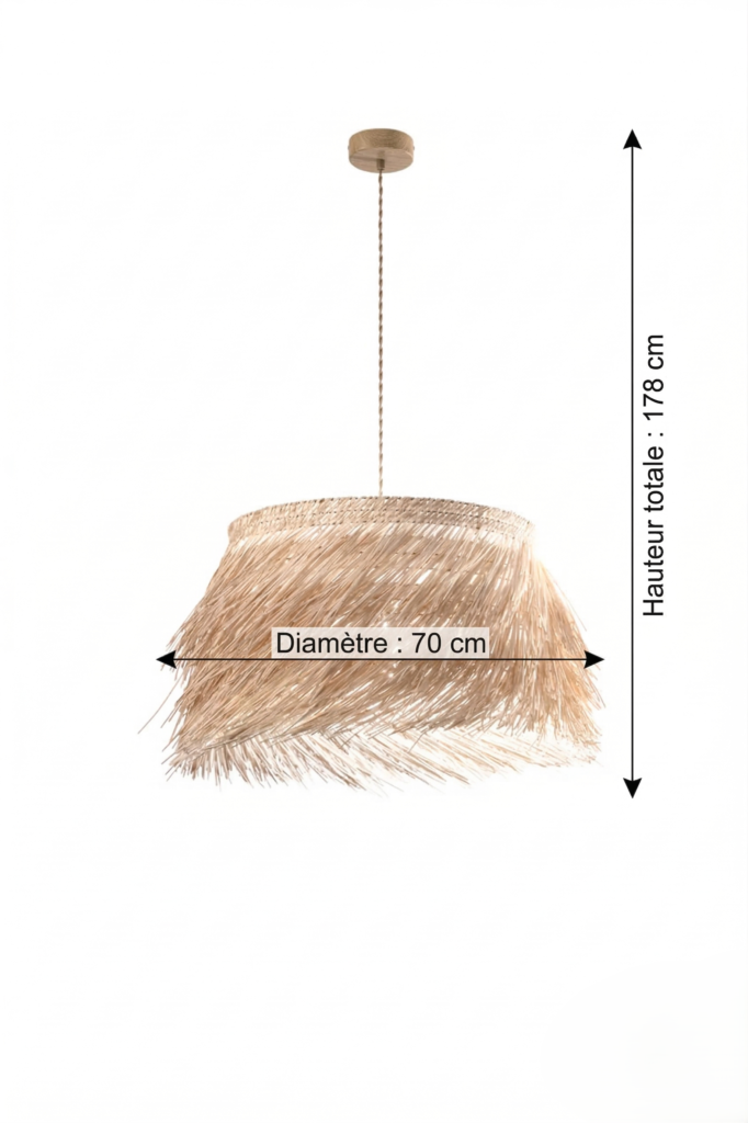 Son diamètre de 70 cm en fait une véritable pièce d’exception qui structure l’espace autant qu’elle l’éclaire. Installée seule, elle suffit à donner à une salle à manger toute son identité. Groupée par deux ou trois au-dessus d’un long îlot de cuisine ou d’une table rectangulaire, elle crée une composition végétale et rythmée d’un effet spectaculaire. La rosace de ø10 cm assure une fixation propre et discrète, tandis que le câble de 300 cm (ajustable) offre toute la souplesse nécessaire pour adapter la hauteur de suspension à chaque configuration, qu’il s’agisse d’un plafond standard à 2,50 m ou d’un volume plus généreux sous charpente.