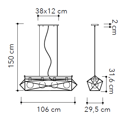 Avec ses dimensions imposantes de 106 × 31,6 cm pour une hauteur de structure de 29,5 cm, cette grande suspension design affirme sa présence avec caractère dans les espaces généreux. La rosace rectangulaire de 38 × 12 cm (hauteur 2 cm) assure une finition soignée et équilibrée au niveau du plafond, tandis que le câble réglable jusqu’à 150 cm offre une flexibilité totale pour adapter la hauteur d’installation selon la configuration de votre pièce et l’effet lumineux recherché.