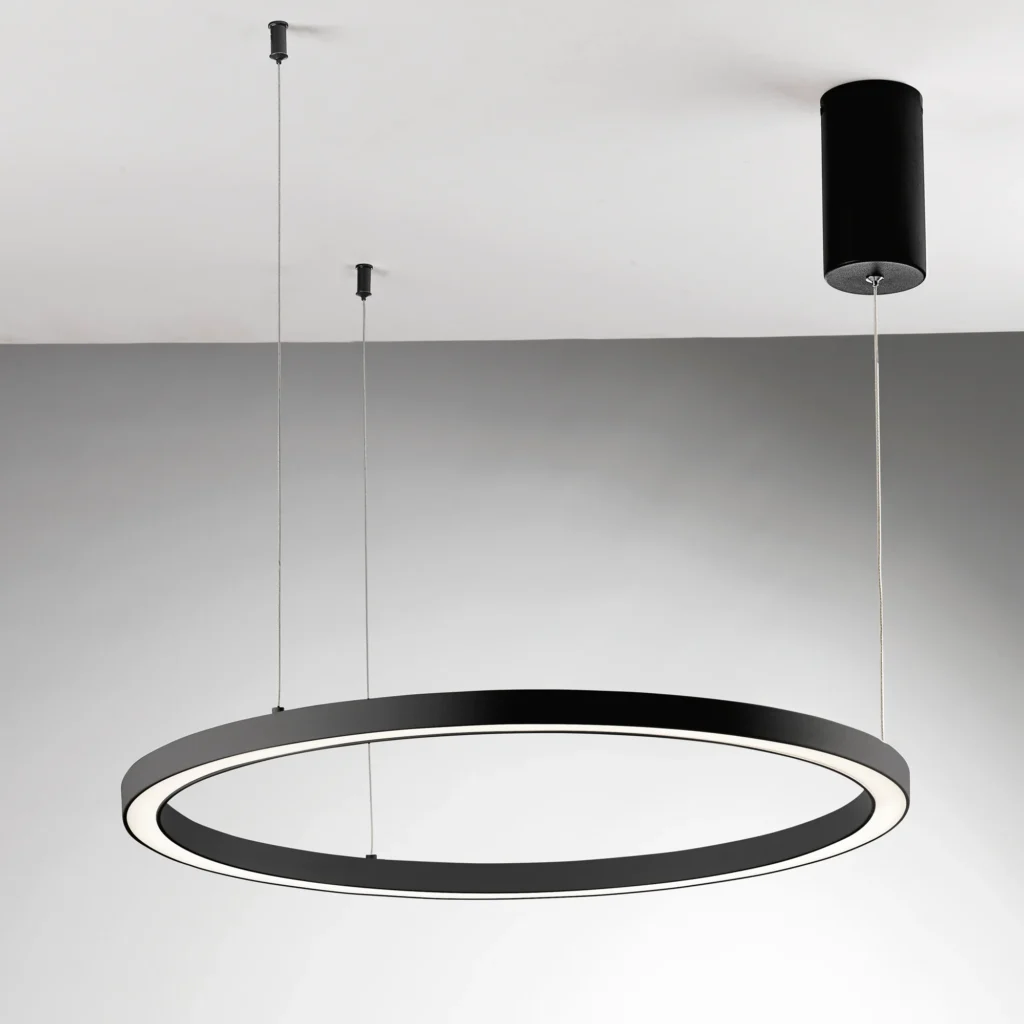 La gamme Hoop s’adapte à tous les projets grâce à ses trois diamètres : Ø60 cm pour les espaces intimistes (bureaux, chambres), Ø80 cm pour les pièces de vie (salons, salles à manger), et Ø120 cm pour les grands volumes (lofts, espaces commerciaux, lobbies). Cette modularité dimensionnelle permet de créer des compositions rythmées en associant plusieurs tailles et finitions. Les câbles réglables en hauteur offrent une flexibilité d’installation totale, s’adaptant aux contraintes architecturales et aux préférences esthétiques.