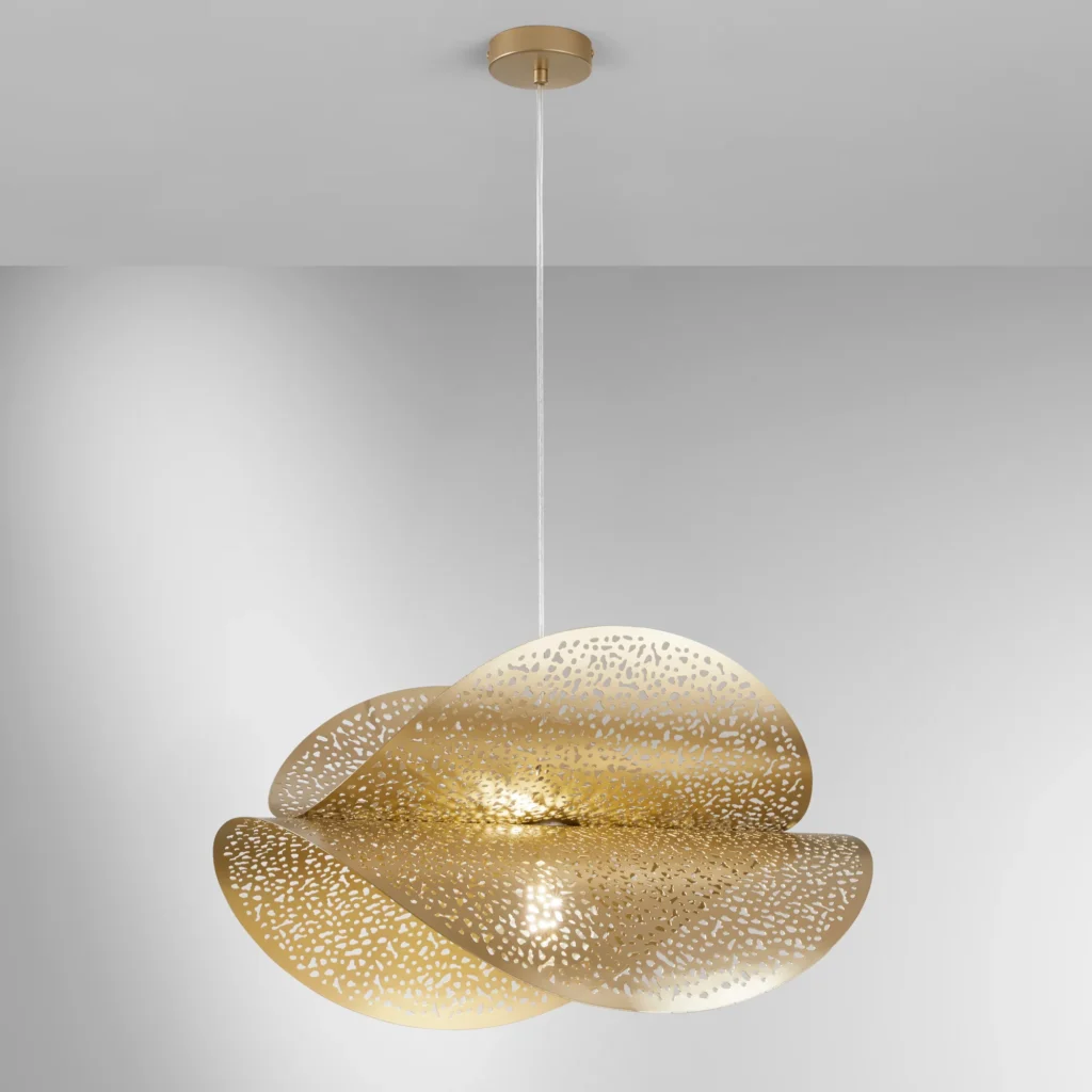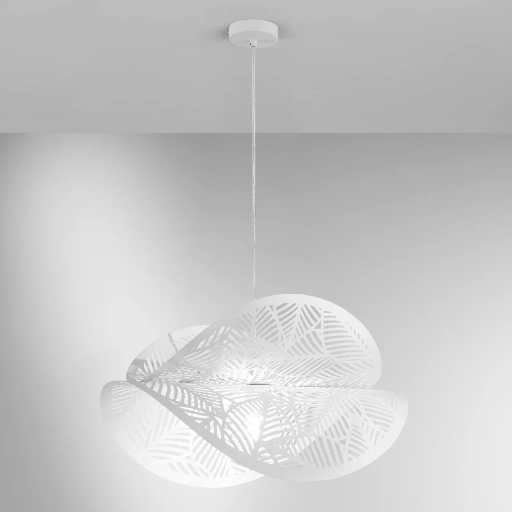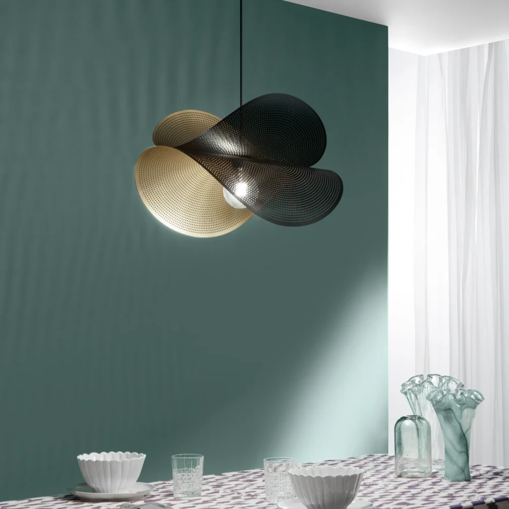 La collection RHEI incarne une philosophie du design où la pureté des lignes rencontre la légèreté visuelle. Cette suspension se distingue par sa structure en métal perforé, minutieusement travaillé pour offrir une transparence subtile qui laisse filtrer la lumière de façon poétique. Les deux voiles ondulées, disposées en parfaite harmonie, créent un mouvement figé dans l’espace, évoquant la grâce d’une voile gonflée par le vent ou le frémissement d’une feuille portée par la brise.