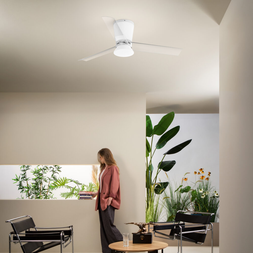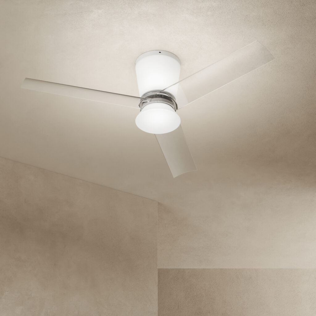 Le premier regard sur l’Everest suffit : là où la plupart des ventilateurs plafond LED s’imposent comme un élément technique, celui-ci disparaît dans la composition visuelle de la pièce. Ses pales thermoplastiques transparentes créent un effet d’optique saisissant — elles tournent sans alourdir, laissant percevoir le plafond à travers, comme si l’air lui-même prenait forme. Le corps blanc mat, aux lignes arrondies et compactes, abrite un diffuseur acrylique intégré qui projette une lumière enveloppante, sans éblouissement, parfaitement adaptée aux ambiances résidentielles soignées.