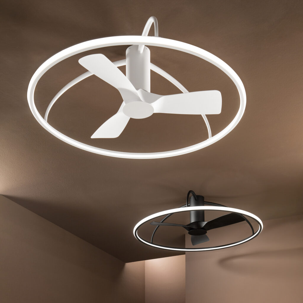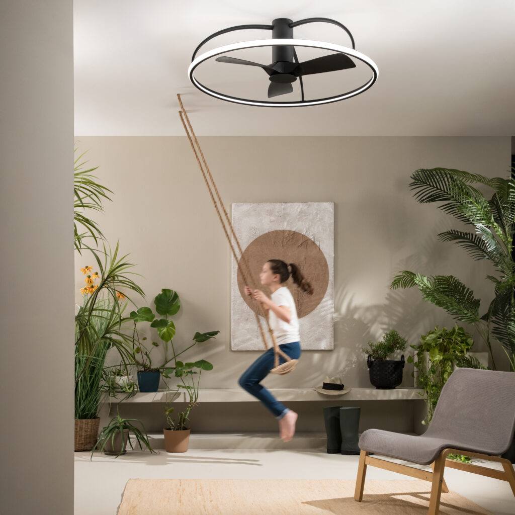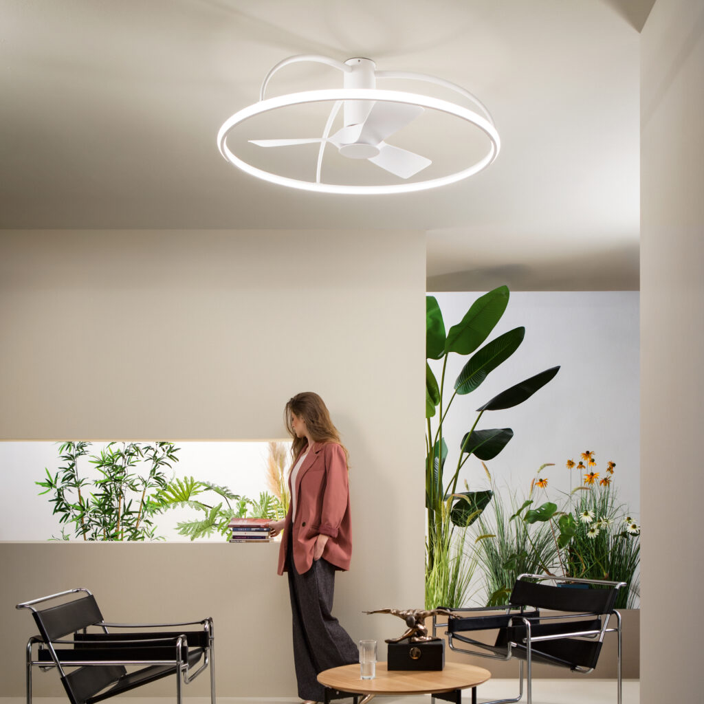Disponible en blanc avec pales blanches ou en noir avec pales noires, le Magnus s’adapte avec une égale élégance à deux esthétiques opposées mais tout aussi affirmées : l’intérieur minimaliste scandinave baigné de lumière, ou le loft industriel aux finitions sombres et aux contrastes assumés. Dans les deux cas, le grand ventilateur de plafond LED devient le point focal naturel du plafond — celui autour duquel tout le reste s’organise.