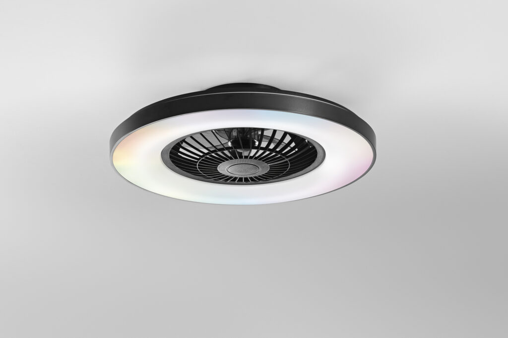 Ventilateur de plafond lumineux Garbin : LED 40 W, 5 500 lm, CCT/RGB, enceinte Bluetooth intégrée, moteur DC silencieux. Blanc ou noir. Découvrez le sur Lumi-One.