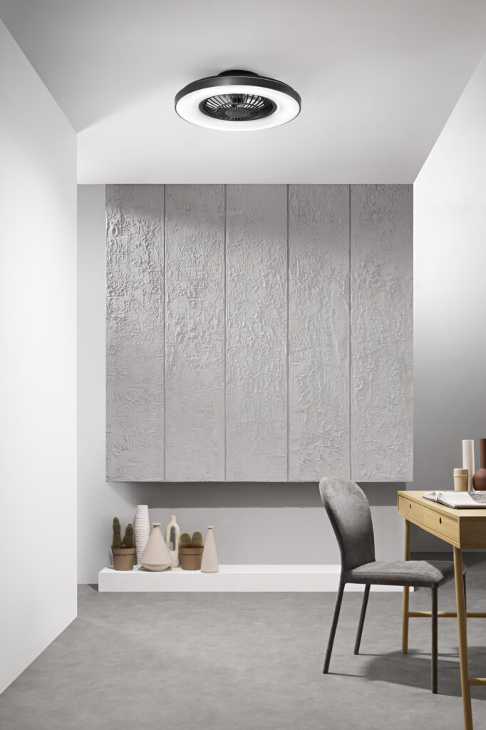 La version blanche s’intègre avec fluidité dans les intérieurs lumineux, les plafonds clairs, les décorations nordiques ou minimalistes. La version noire apporte un caractère affirmé, idéale pour un salon design, un espace loft, une chambre aux tonalités sombres ou un bureau home office à l’esthétique soignée. Dans les deux cas, la hauteur de seulement 150 mm sous plafond le rend compatible avec des volumes standards, sans empiètement visuel excessif.