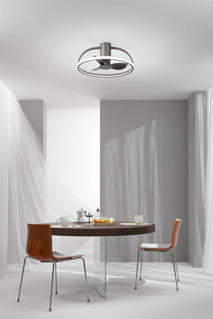 Le ventilateur de plafond lumineux Hadley incarne une approche résolument moderne du confort d’intérieur. Sa structure en aluminium robuste associée à un diffuseur en polycarbonate blanc offre un rendu épuré, à la fois solide et élégant. Le profil compact — Ø 60 cm pour seulement 27 cm de hauteur — en fait un appareil que l’on remarque sans qu’il ne domine visuellement l’espace. Cette sobriété formelle est précisément ce qui lui confère une présence si affirmée dans les intérieurs actuels.