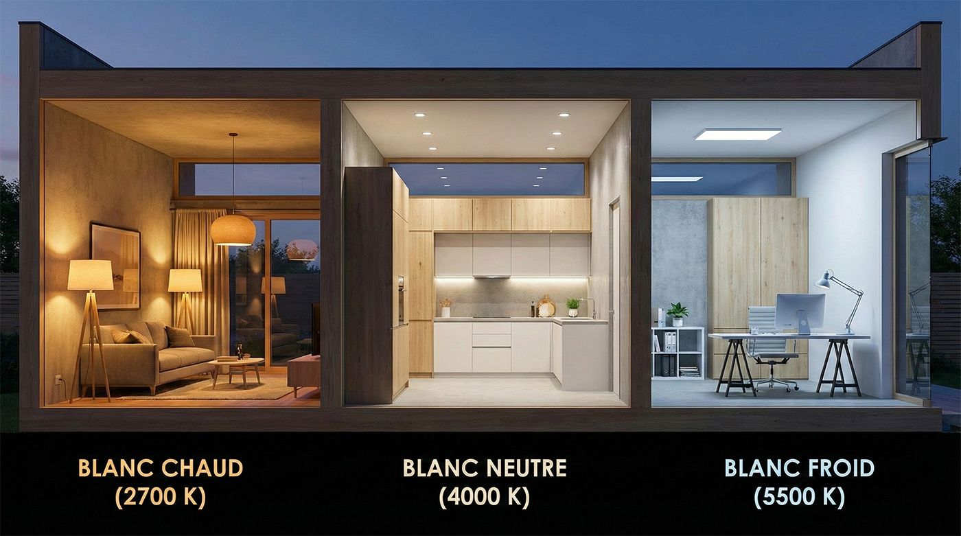 Le choix entre blanc chaud ou blanc froid dépend de la fonction de l’espace et de l’expérience souhaitée.